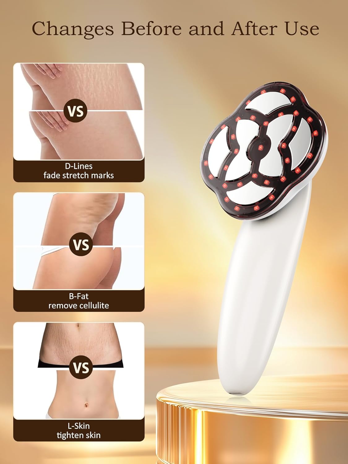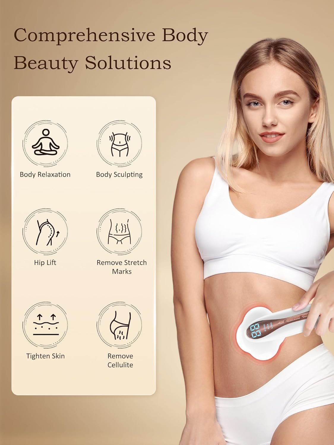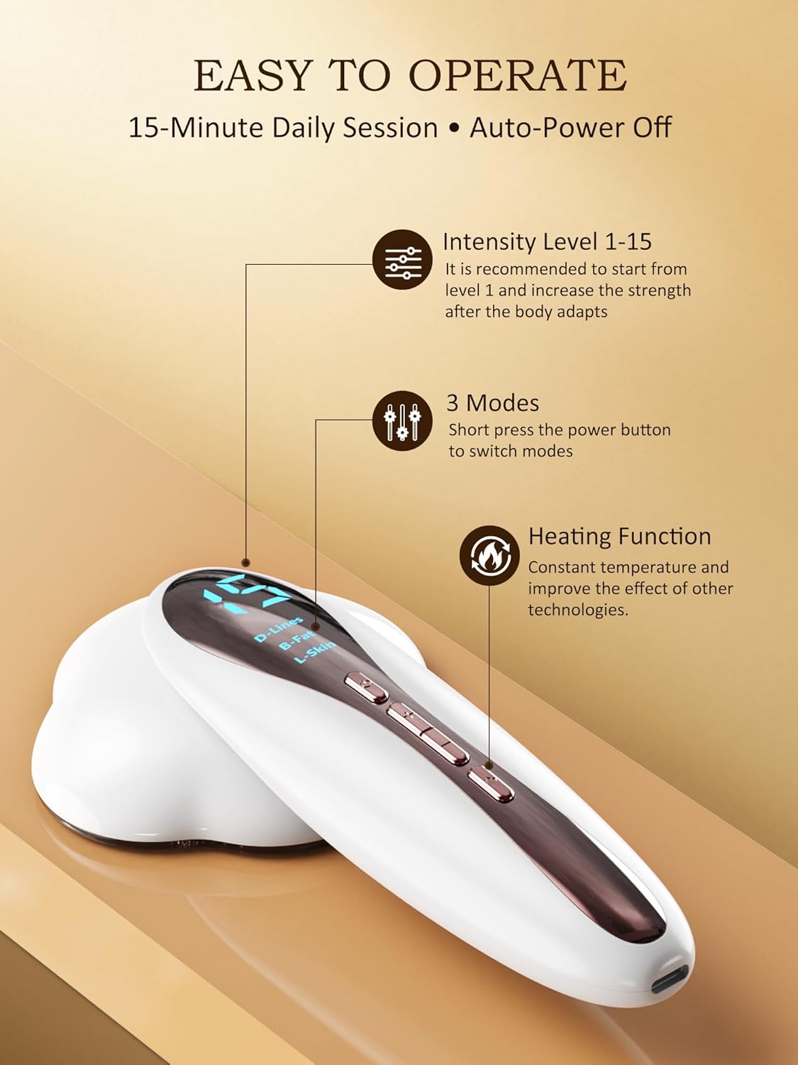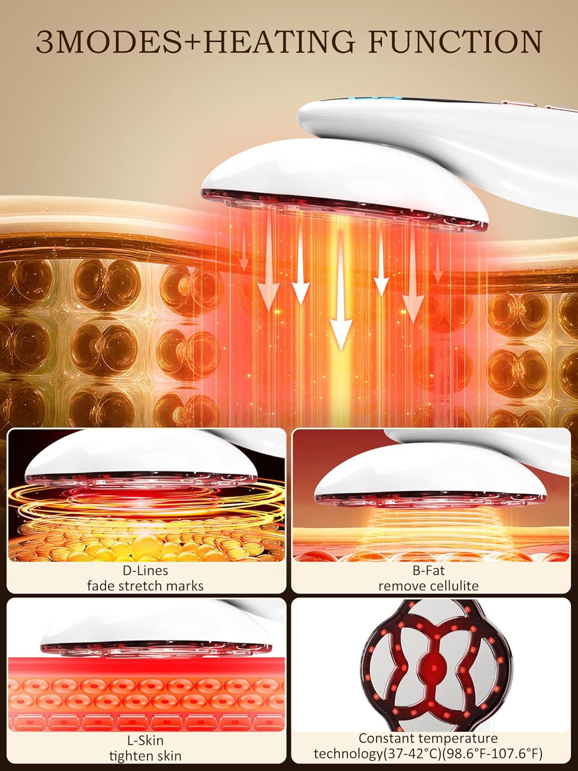 Multi-Function Body Sculpting Machine:The professional massager cellulite remover offers 3 advanced modes, all equipped with heating, vibration function, and 15 levels of intensity adjustment. Tailor your exclusive shaping plan with ease.The anti cellulite massager features 33 lamp beads that provide constant heat at 37 - 42°C (98.6 - 107.6°F), enhancing comfort and boosting absorption for superior results